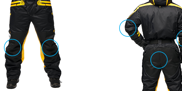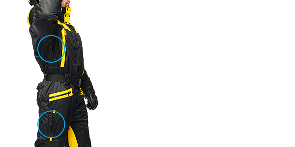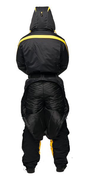 - В качестве опции предназначенной для комфортной эксплуатации зимнего комбинезона, предусмотрено отстегивающее седалище брюк. Молния, изнутри данного узла, утеплена дополнительной защитной планкой.