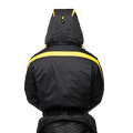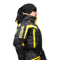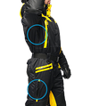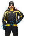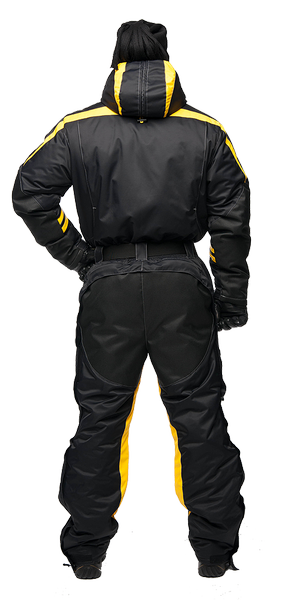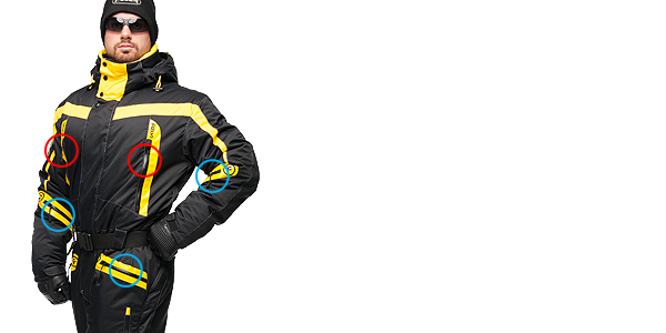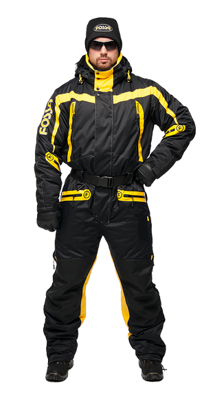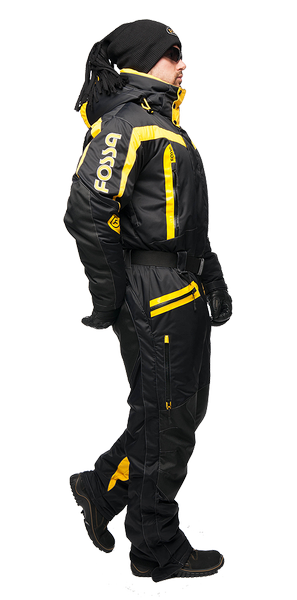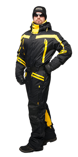 Спортивная экипировка представлена в контрастном цветовом сочетании желтого и черного. Сложный анатомический крой, зимней экипировки линии «FOSSA-adrenalin», подчёркнут внутренними рельефами, выделяющими брутальность мужской фигуры. В качестве дополнительной отделки, для защиты в темное время суток, мы грамотно расположили ярко-желтые вставки, на зимнем комбинзоне из мембранной ткани - «Эволюшин».