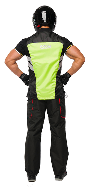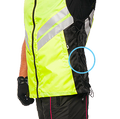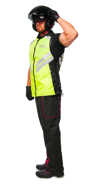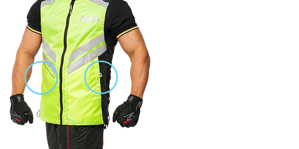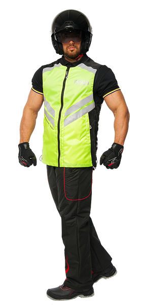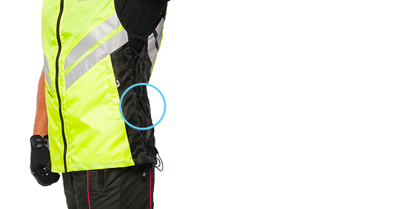 - Удобная боковая регулировка сигнального жилета дает возможность, подтянув или ослабив шнур, скорректировать посадку на термобелье или летнем влаго-грязе-ветрозащитном костюме линии «FOSSA-hot-road»