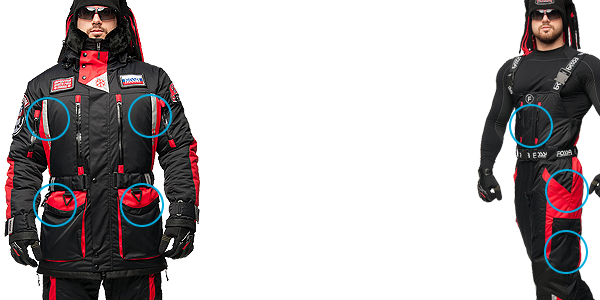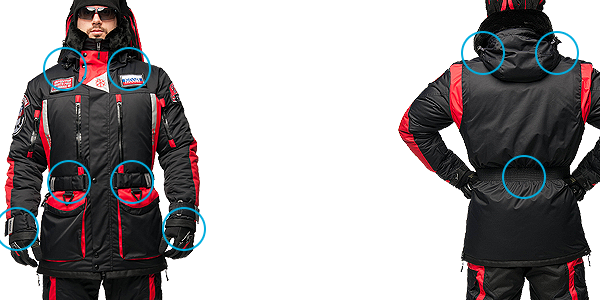 - Костюм из мембранной ткани - «NORTH POLE» оснащен множеством вместительных, утепленных карманов, защищенных влагозащитными молниями и специальными сного-водоупорными отводами.