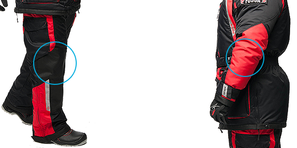 - Усиленные накладки из сверхпрочного материала – KORDURA ®. Данная опция защиты от влаги и истирания, зимнего костюма «NORTH POLE», предусмотрена в местах максимального контакта – локтей, коленей и седалища брюк.