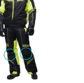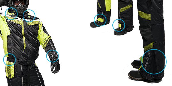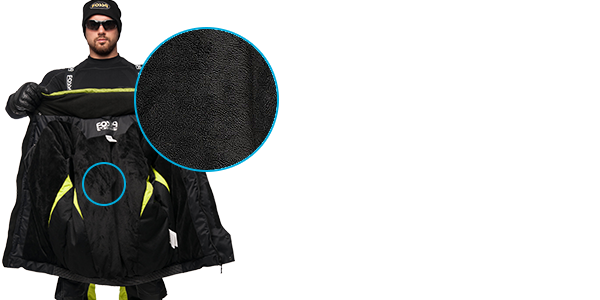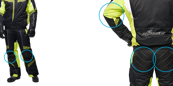 - В качестве дополнительной защиты от холода и влажности, на локтях куртки и седалище полукомбинезона предусмотрены вставки из полиуретана.