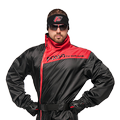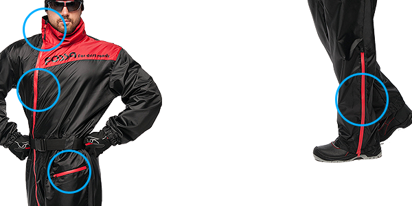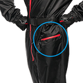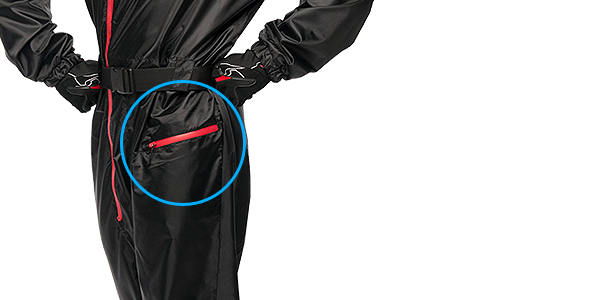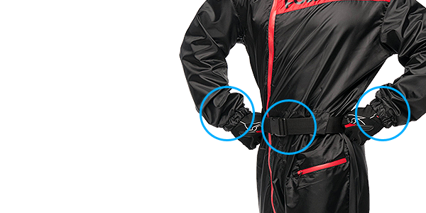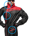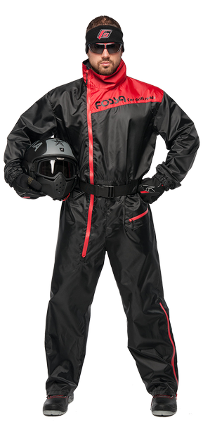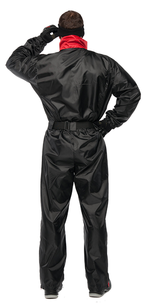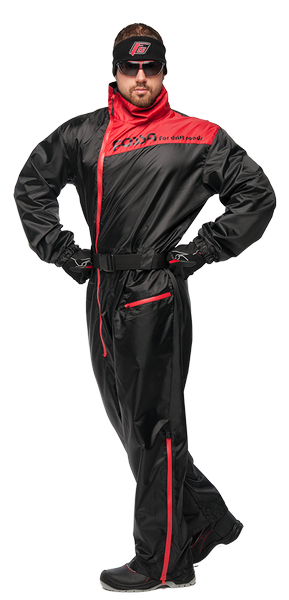 Спортивный комбинезон представлена в контрастном цветовом сочетании черного и красного. В качестве отделки и защиты от воды, мы использовали влагозащитные красные молнии.