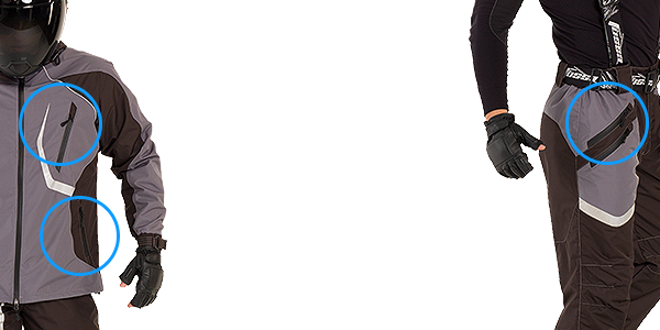 - Изделие оснащено удобными и вместительными потайными карманами внутри изделия и карманами с внешней стороны куртки и брюк. Внешние карманы защищены влагостойкими молниями.