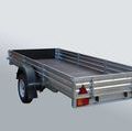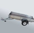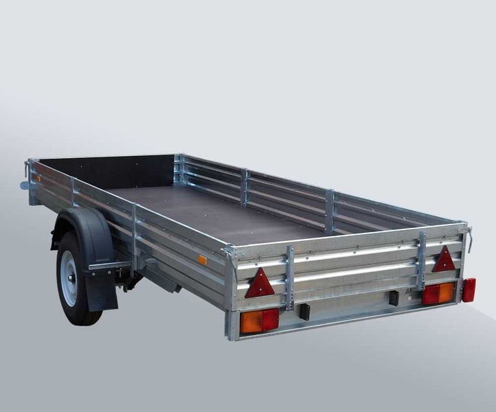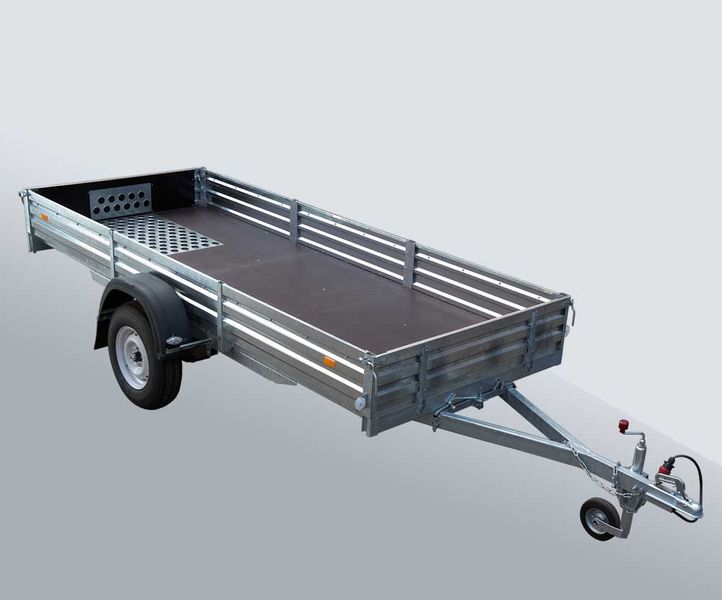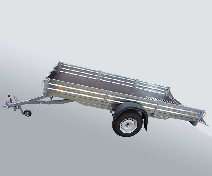 Рессора. Автомобильный прицеп для спортивных, утилитарных снегоходов, другой мототехники (квадроциклов (ATV, мотоциклов) и др. грузов.Дышло быстро отстегивается, усиленный задний борт откидывается на тросиках. Крылья пластмассовые. На полу и заднем борту установлен лист с просечкой. Антикоррозийное покрытие (методом горячего оцинкования) надежно защищает металлоконструкцию, что обеспечивает долговечность прицепа.